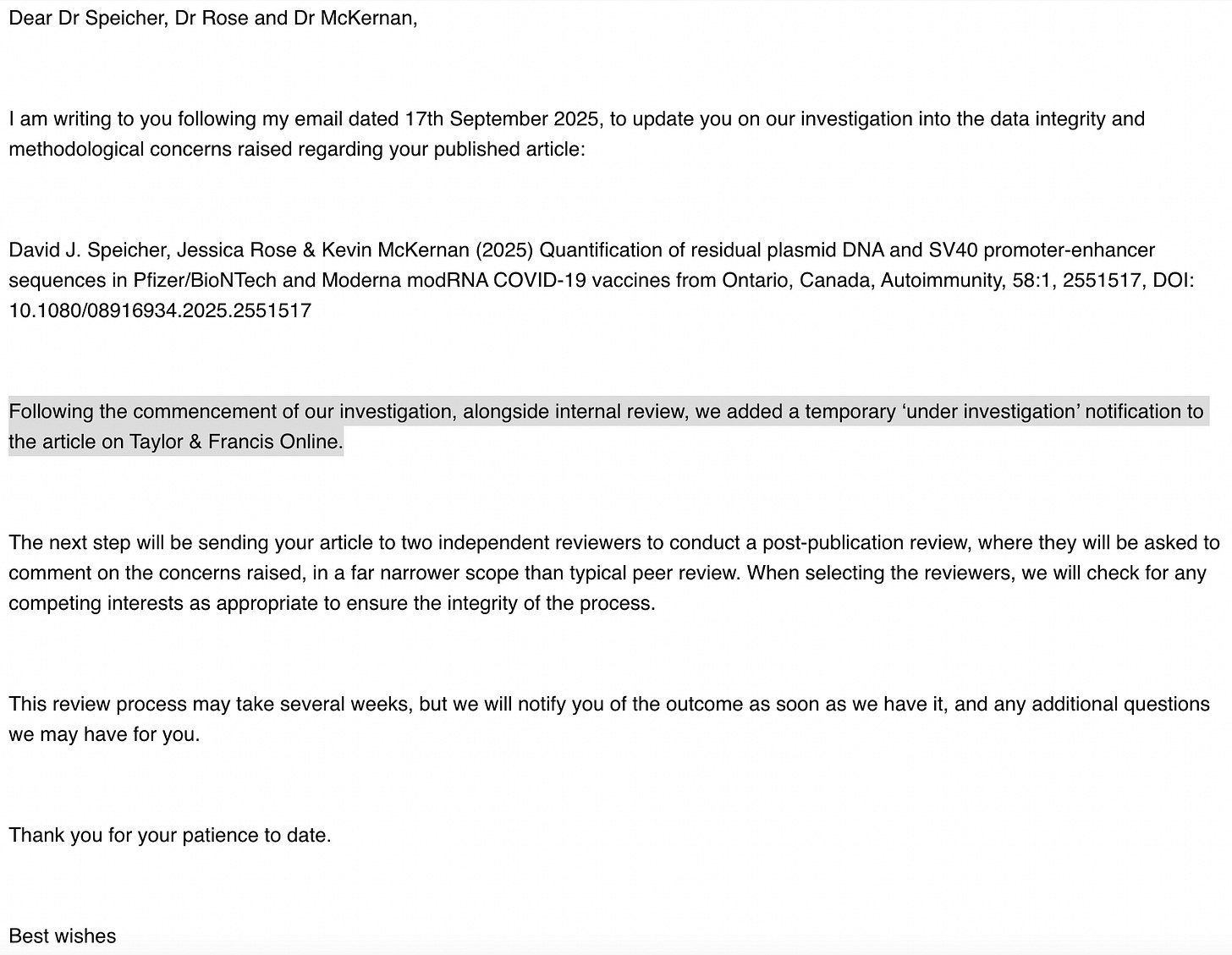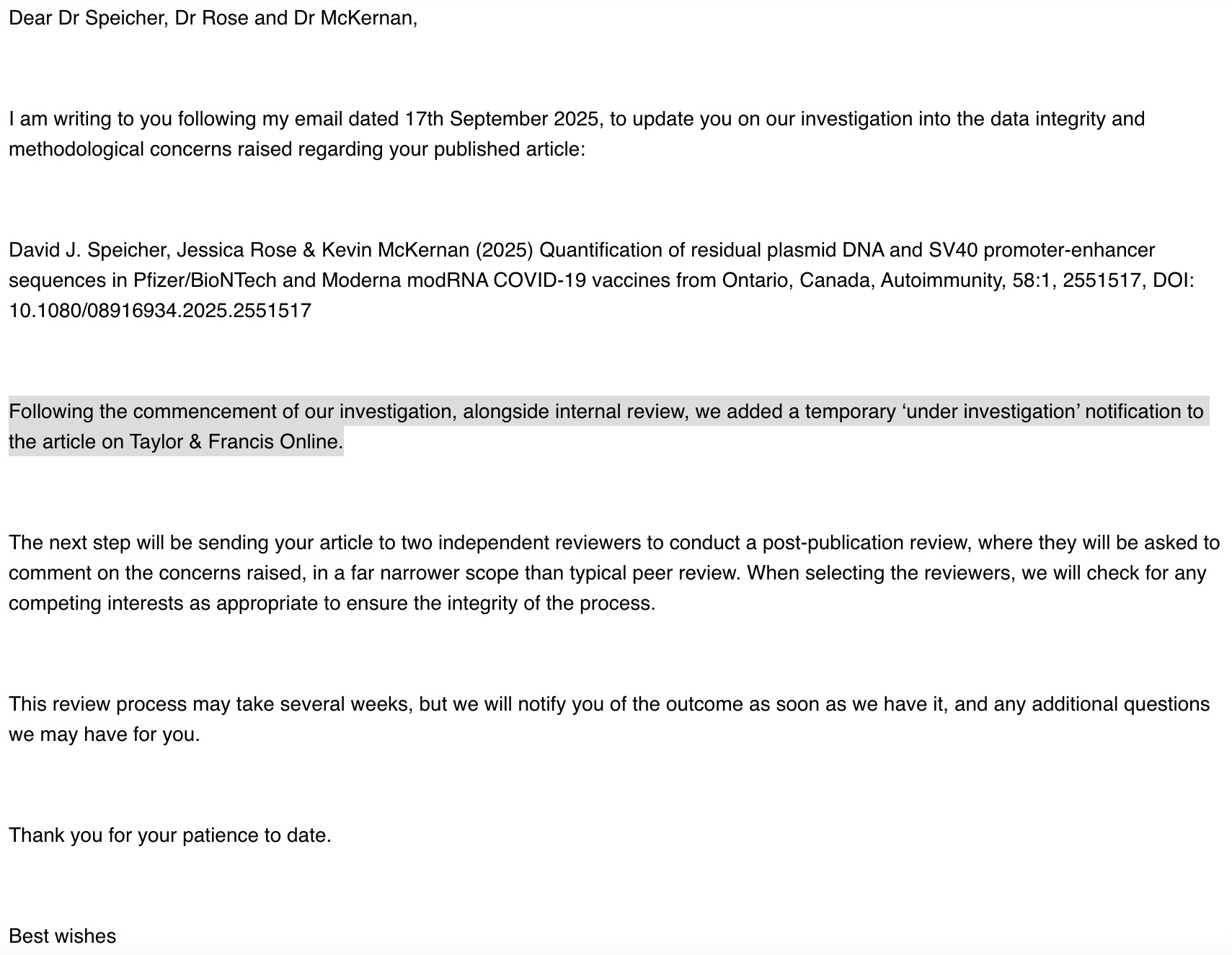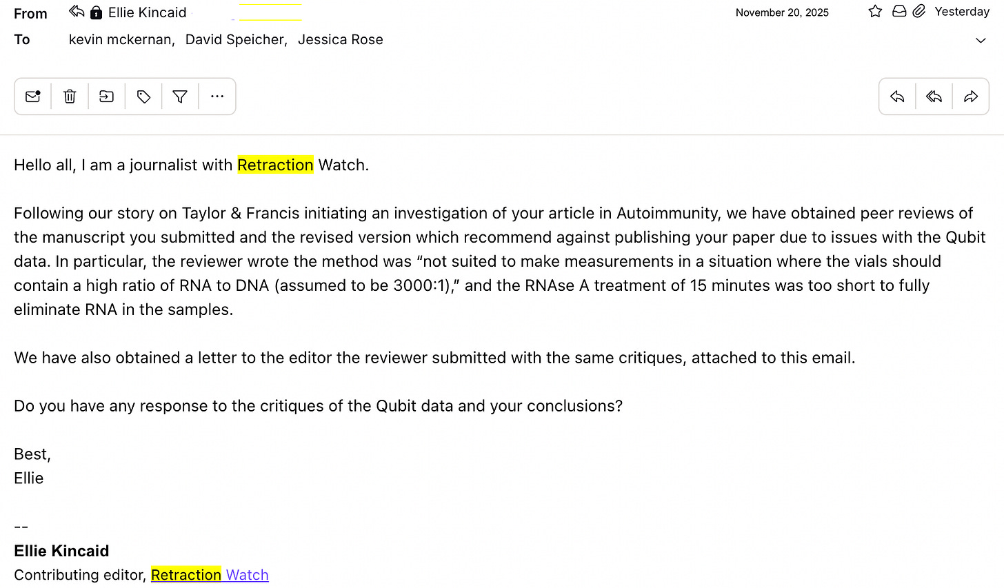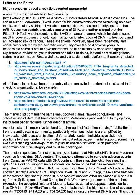 I woke up the other morning to the next step in the retraction attempt on our seminal paper published in Autoimmunity entitled: Quantification of residual plasmid DNA and SV40 promoter-enhancer sequences in Pfizer/BioNTech and Moderna modRNA COVID-19 vaccines from Ontario, Canada.1