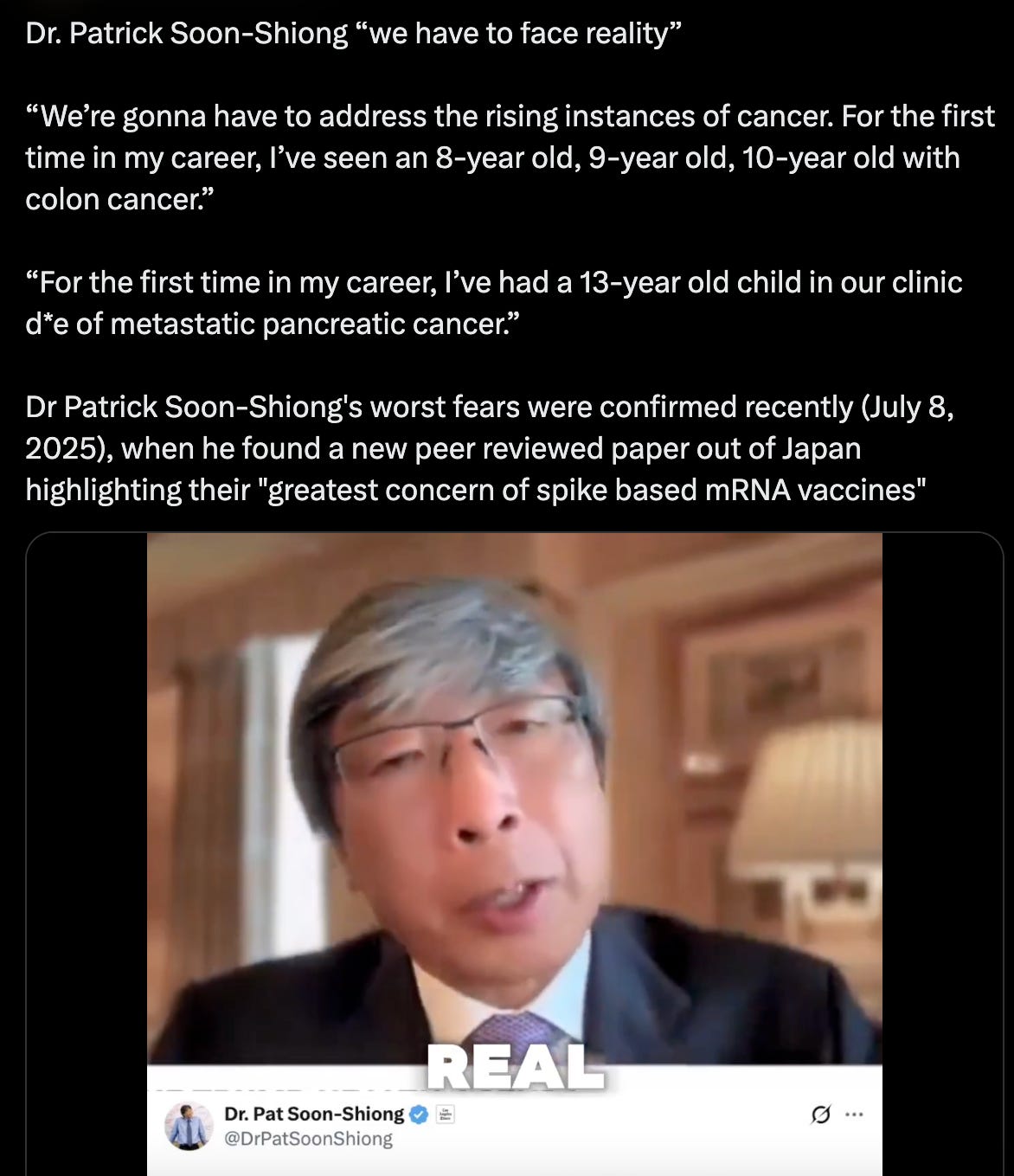 There has been a recent call by Dr. Patrick Soon-Shiong for us to “face reality” in the context of rising instances of cancer, specifically colon cancer. He describes his experiences with new cases of colon cancer in small children that he’s never seen previously in his career (posted on X below).