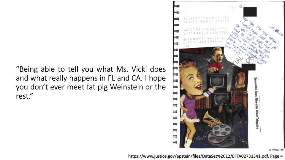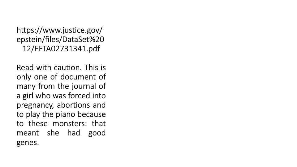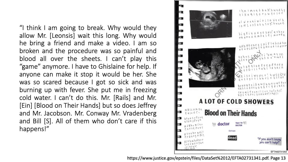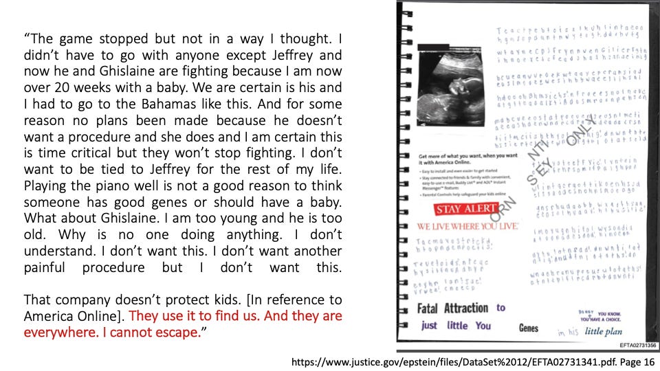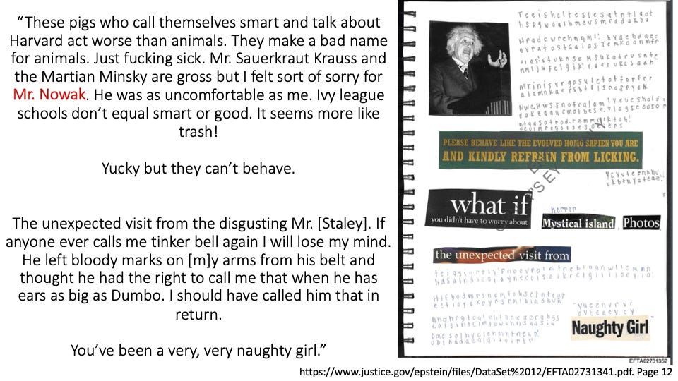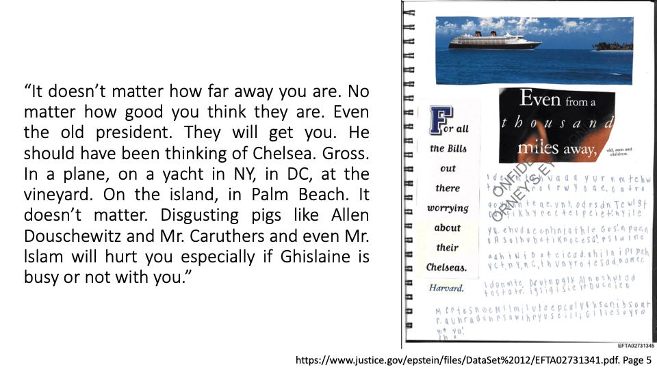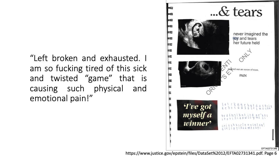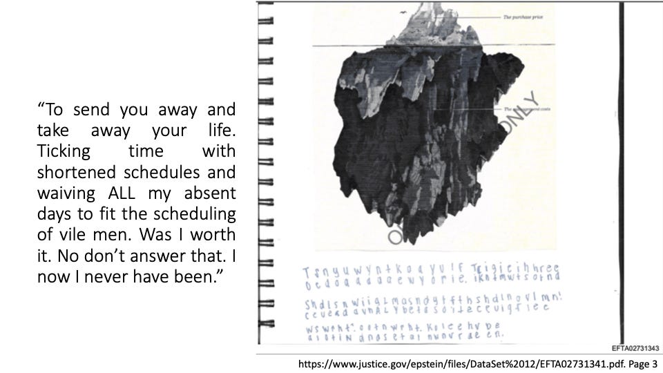 In her words, amazingly, you will hear empathy for Ghislaine (allegedly because she loved Jeffrey and was his age) while she, herself, bleeds through imposed torture. You will hear anger and disgust at the “gross” men who abused her. You will hear power and might in the simple fact that she took all of this time to “encode” her inner world → likely a means for her to stay sane, to self-reflect and even perhaps, one day, to have others know what she was subjected to.