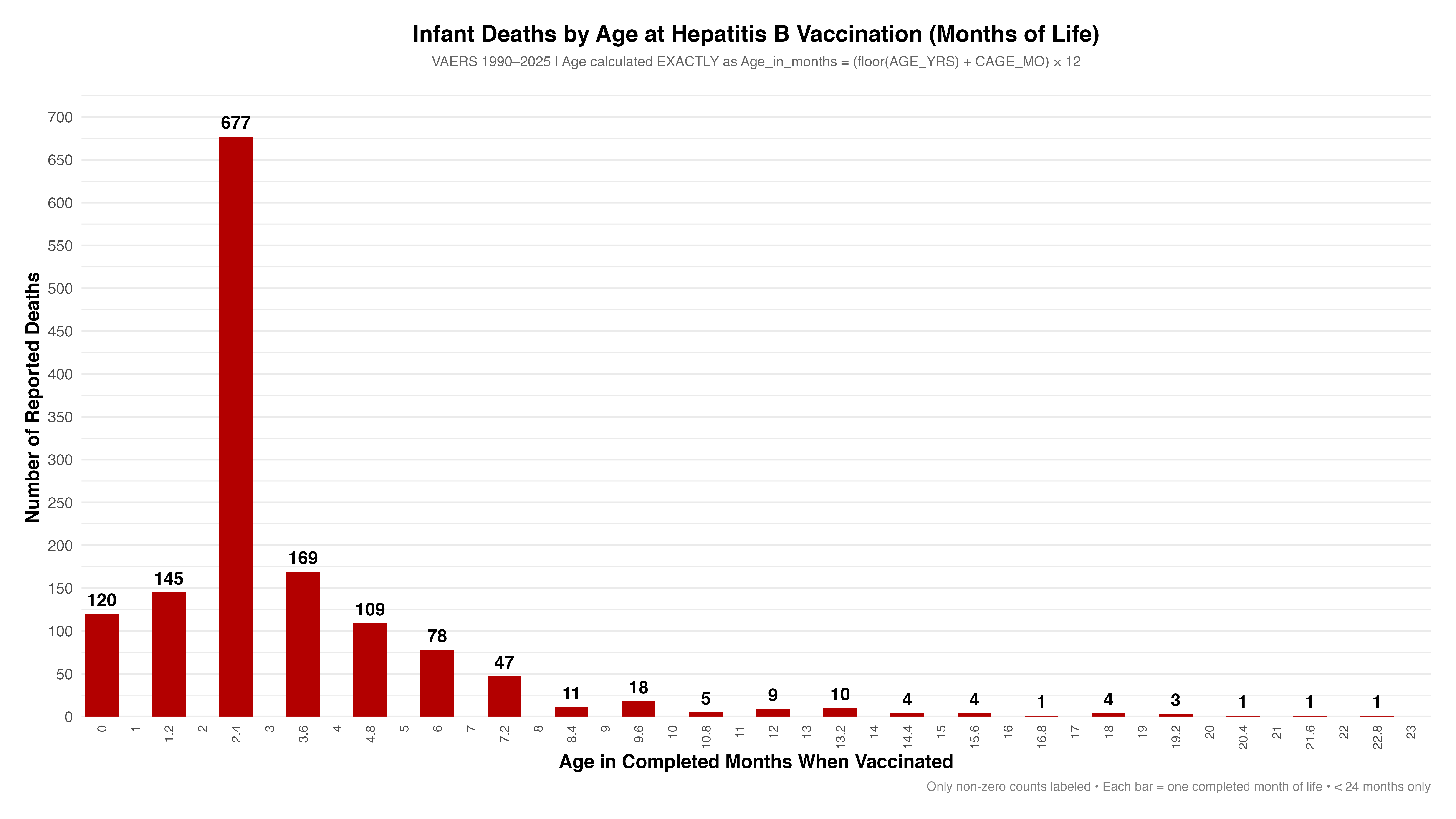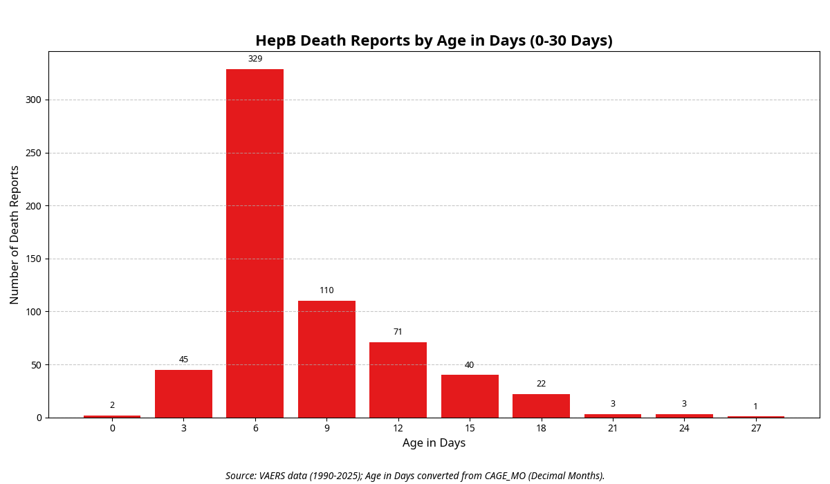 The following bar chart showing deaths by week for all VAERS data from 1990-2025 for HepB vaccines shows the count (frequency) of reports across discrete age bins (Weeks old), and it’s very telling. Most of the reports of death occur in week 1.