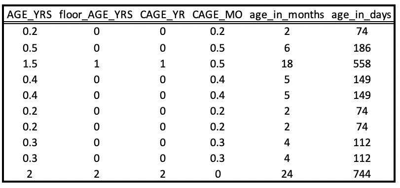 The CAGE_YR variable is the floor of AGE_YRS but since there is far more data in the AGE_YRS variable, it is important to floor it manually rather than use the CAGE_YR variable to calculate the age in months and days from the CAGE_MO variable.