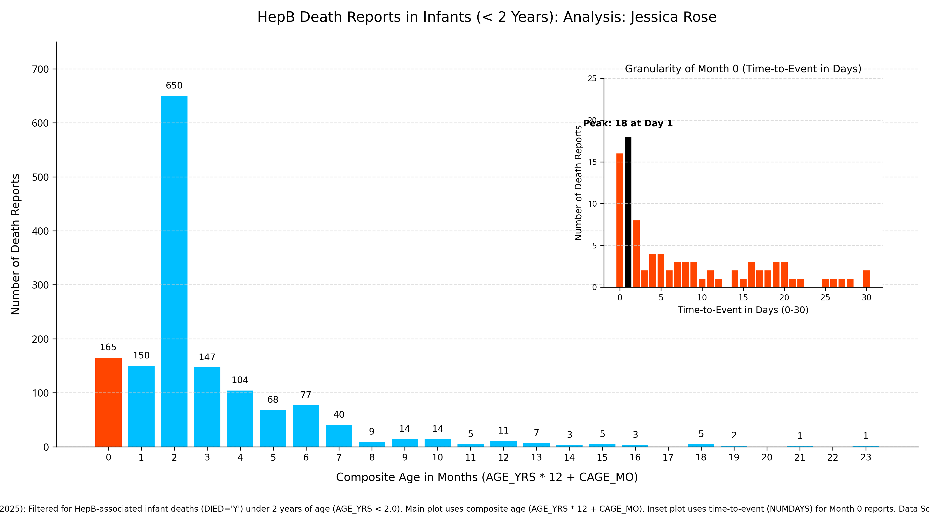 In the slide below, the larger graph shows all VAERS data by month according to the composite age interpretation as denoted in the VAERS Data Use Guide (AGE_YRS = AGE_YRS * 12 + CAGE_MO).1 The inset graph blows up the data in the red bar representing all infant deaths at month 0 for children under 2 in the context of HepB vaccination reports and the temporal information gained is clear: most infants death reports occur on day 1.