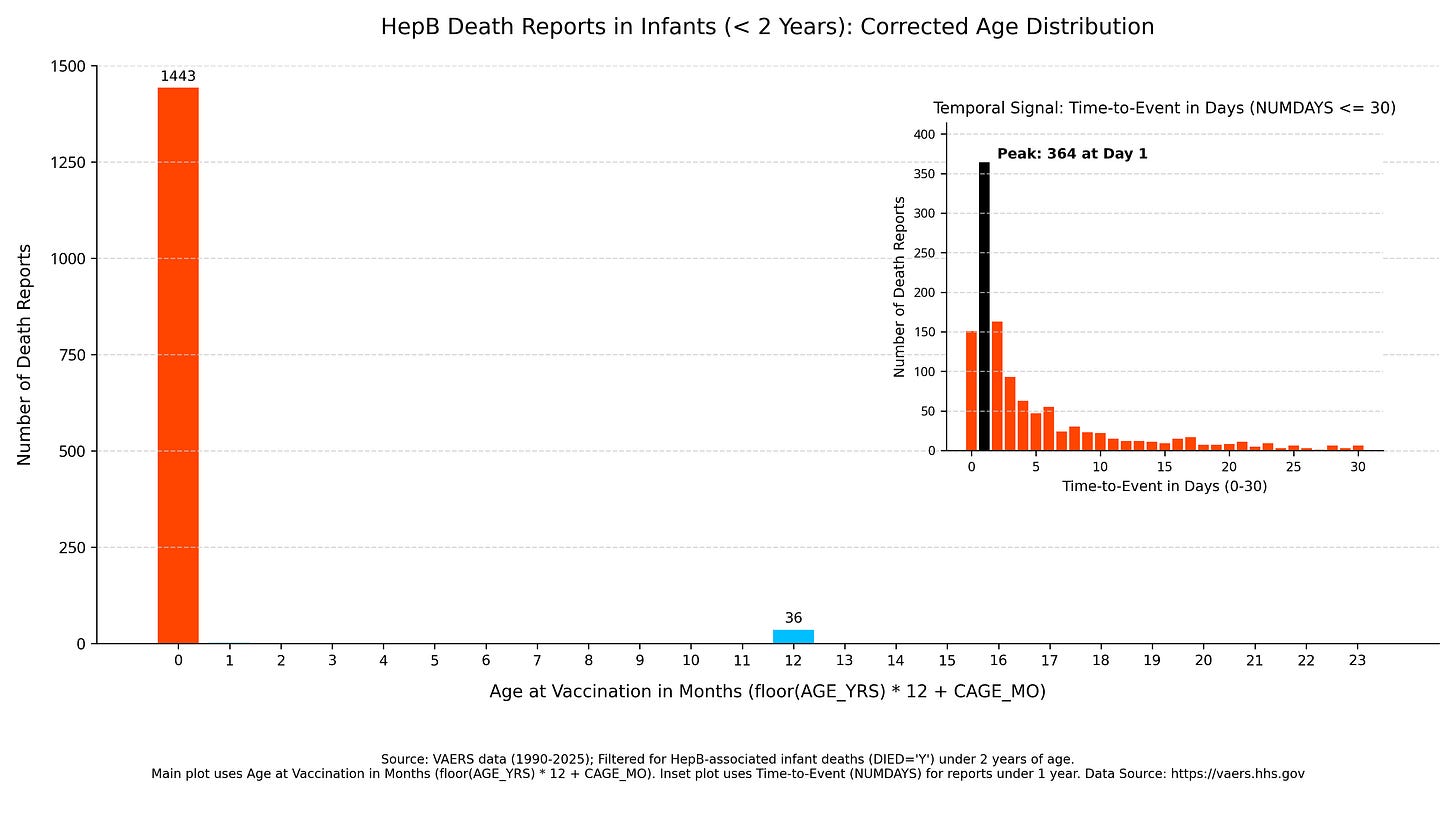This changes EVERYTHING. With respect to infant data - which is exceedingly important when considering vaccines administered at birth such as the Hepatitis B vaccine - there are a lot of temporality safety signal data in VAERS to be had.