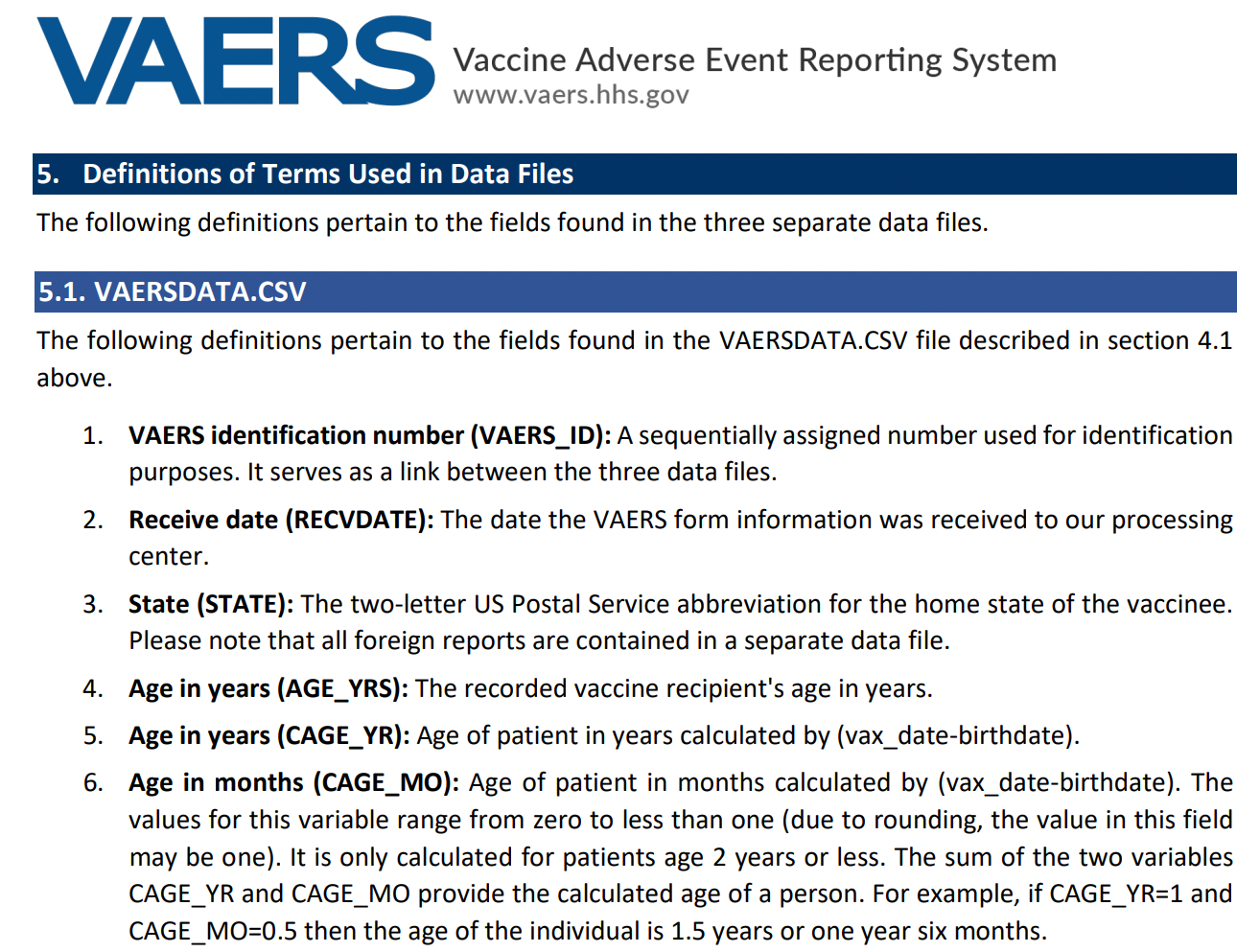 This is weird to me: why are they using the vax_date to calculate the Age of patient years and months? It is also written that the CAGE_MO data is only collected for individuals 2 years-old or less. And indeed, as I had understood from the VAERS Data Use Guide, the age is calculated from the CAGE_YR and CAGE_MO variables by adding them. If CAGE_YR is 1 and CAGE_MO is 0.5 then the individual is 1.5 years old.