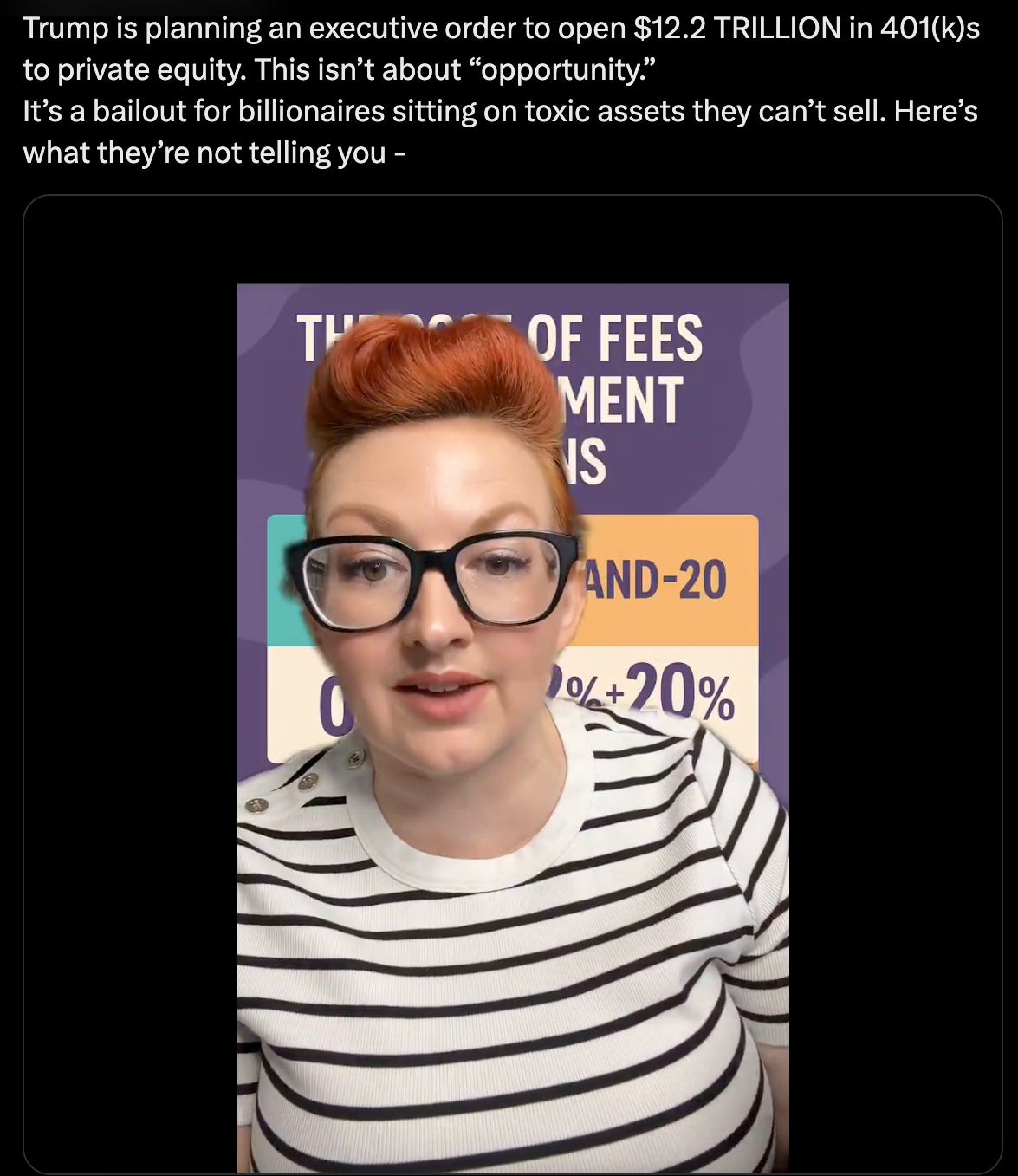 Protect your 401ks from private equity firm abuse and exploitation. Contact Donald Trump and/or your senators to stop this. According to Tiffany, the lobbyists are in DC now. An executive order is pending to open the floodgates to tap 12 trillion dollars in 401k holdings in America.
