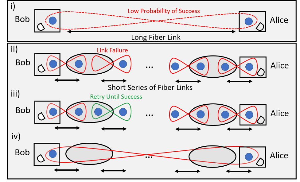 Before I try my best to explain quantum repeater technology, just think of it like in the context of that old saying: “Distance makes the heart grow fonder”. In quantum repeater world however, this might be better expressed as: “Distance doesn’t make love dissipate”. Alice and Bob are linked forever.